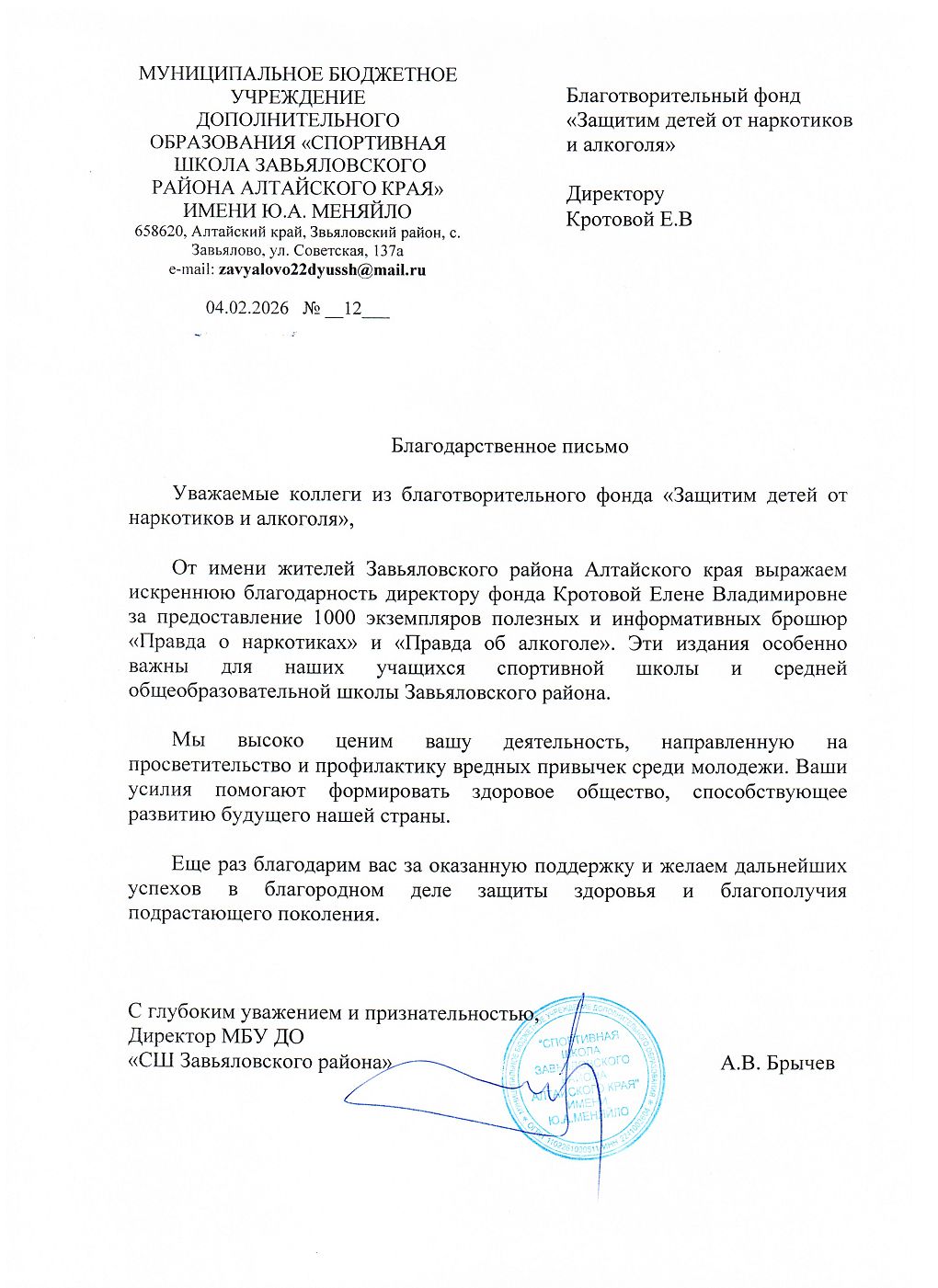 Назначение платежа: Благотворительное пожертвование на профилактические брошюры.